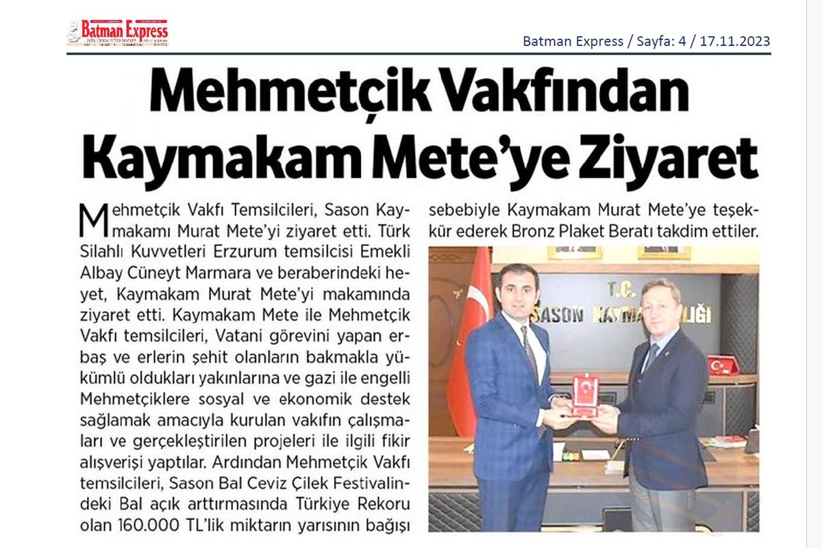 Mehmetçik Vakfı'ndan Kaymakam Mete'yi Ziyaret
